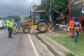 Demolição administrativa remove ocupação irregular que bloqueava calçada e parte da pista na avenida Torquato…